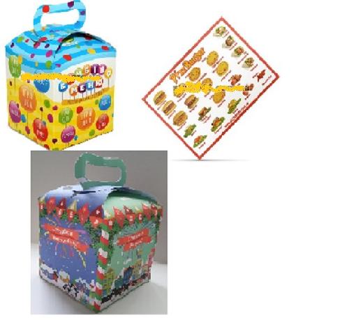 Упаковка Кидс меню.Наша коробка для меню фаст фуда очень удобна в транспортировке и доставке. Т.к. меню подразумевает два и более товара, то коробочка может быть относительно тяжелая и для удобства мы сделали специальные ручки, с помощью коробку можно удобно нести, при этом сохраняя простоту открывания механизма коробки. Размер упаковки для Кидс меню 117 х 117 мм., высота 132 мм.